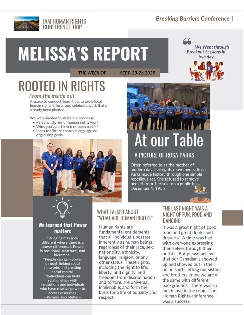 The IAM Human rights conference held in Atlanta from September 24-26, 2025 was a spectacular display of the abundant and powerful energy that our Union is charged with. It was a reminder that “when workers stand together, there is nothing that we can’t achieve.” The air was filled with incredible momentum and a shared commitment to tear down barriers.